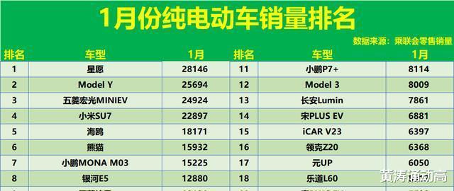 2025年1月纯电动车销量排名显示,仅9款车型过万。特斯拉Model Y失冠,小米SU7居第四,比亚迪海鸥列第五。元PLUS等多款车型销量不足万辆。